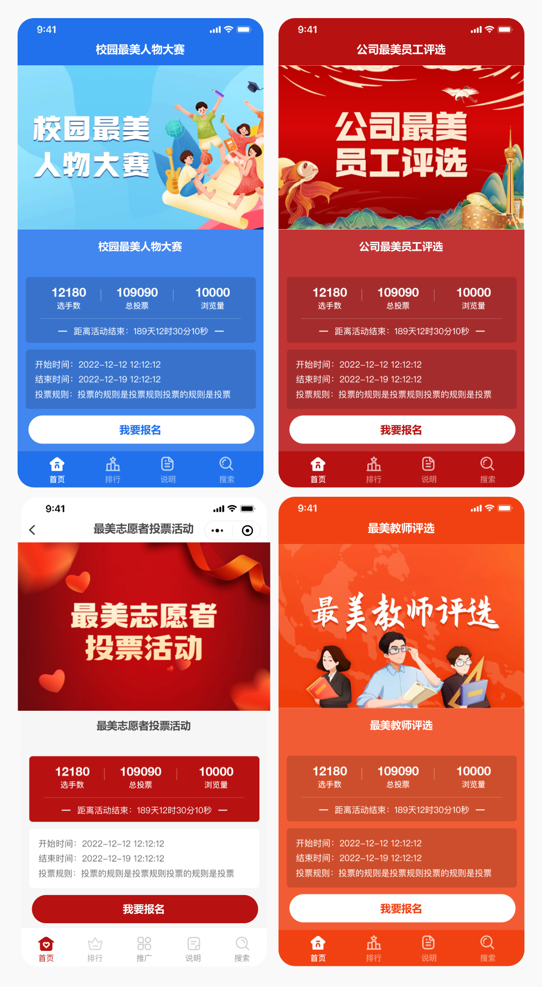 上面四个主题包括公司最美员工评选,校园最美人物大赛,最美志愿者投票活动,最美教师评选,同时也可以做学校最美少年、社区最美家庭等投票活动。投票管家小程序中有上百套通用主题模板,选择您喜欢的更换投票封面图就能适应各类最美系列投票活动。你也可以联系客服帮您免费制作投票封面。