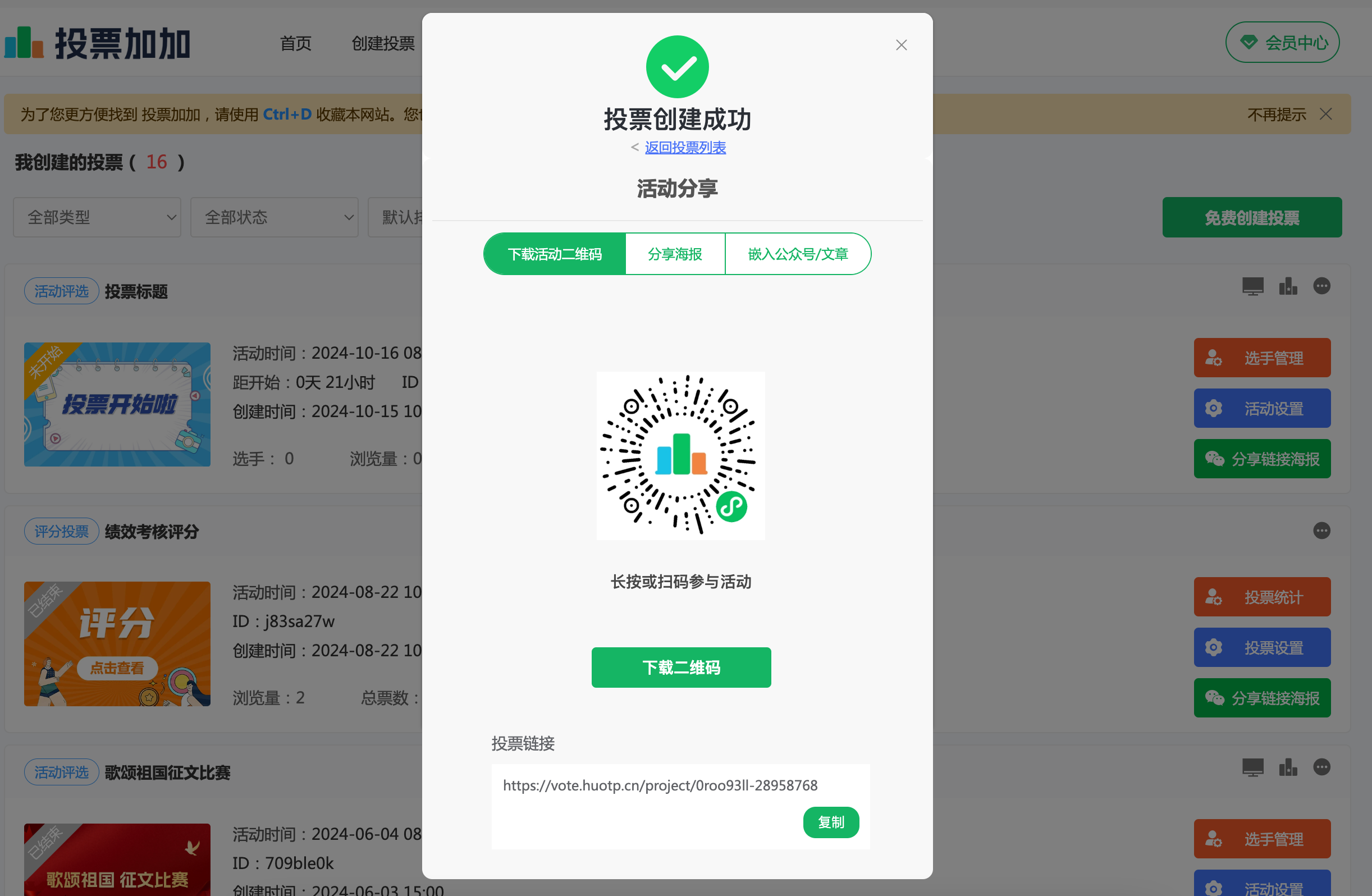 完成所有设置后,点击保存并发布活动。平台将自动生成投票链接、二维码及海报。通过微信等社交媒体,轻松分享评选活动。