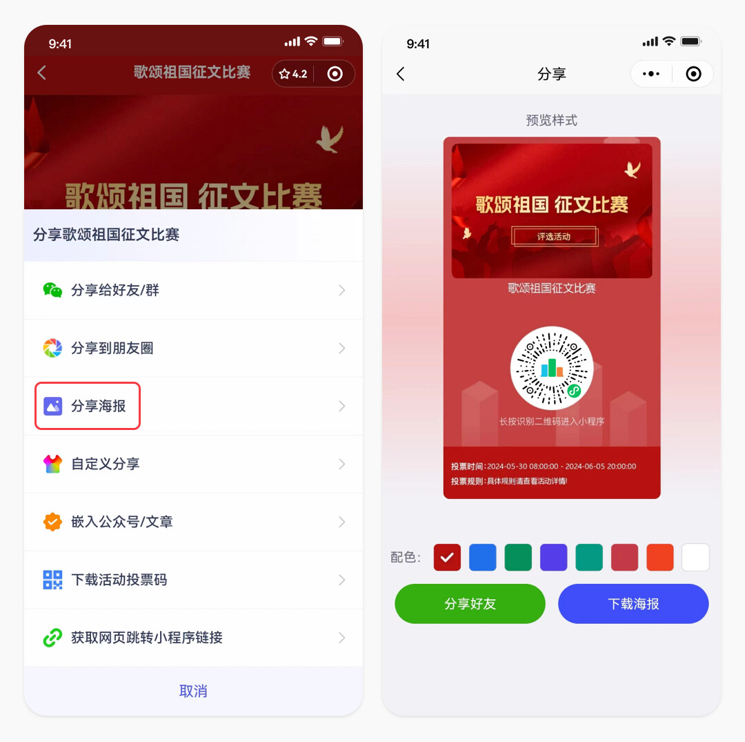 (4)下载活动投票二维码,分享至群聊或朋友圈,参与者直接扫码即可参与。同时,转发给好友将生成投票链接。