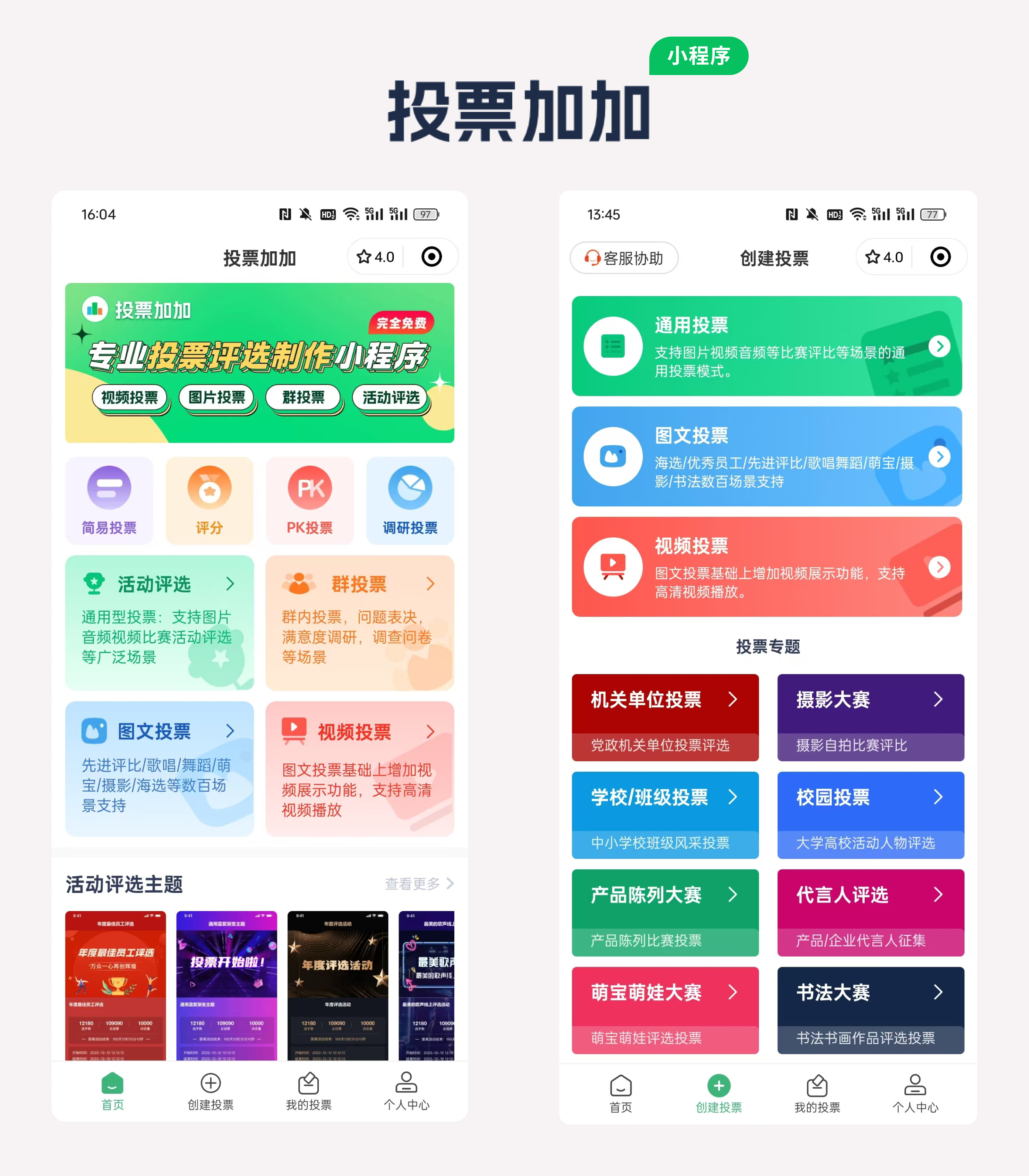 进入投票加加小程序中,选择想要创建的投票类型,例如:群投票、图文投票。视频投票、调研投票、评分投票等。