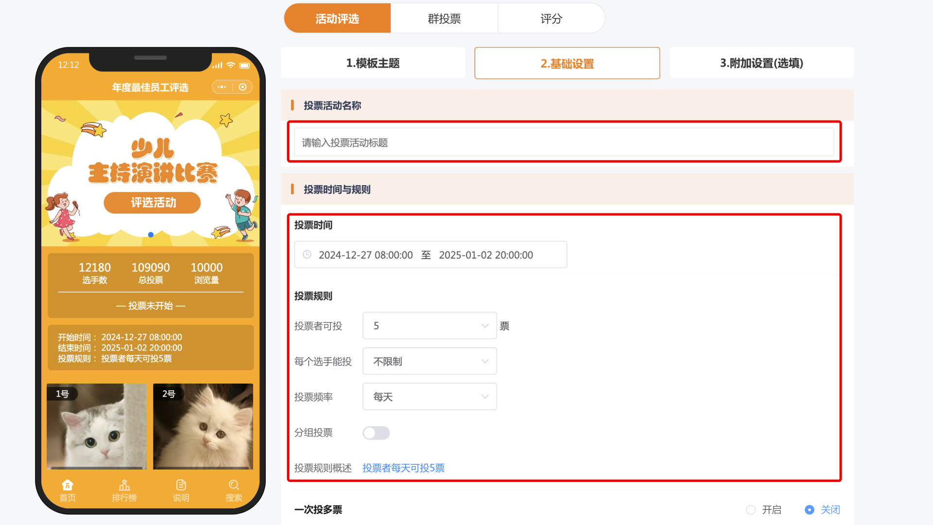 (3)在活动设置页面,配置投票规则,包括是否允许重复投票、每日投票次数限制、是否需要验证码等。