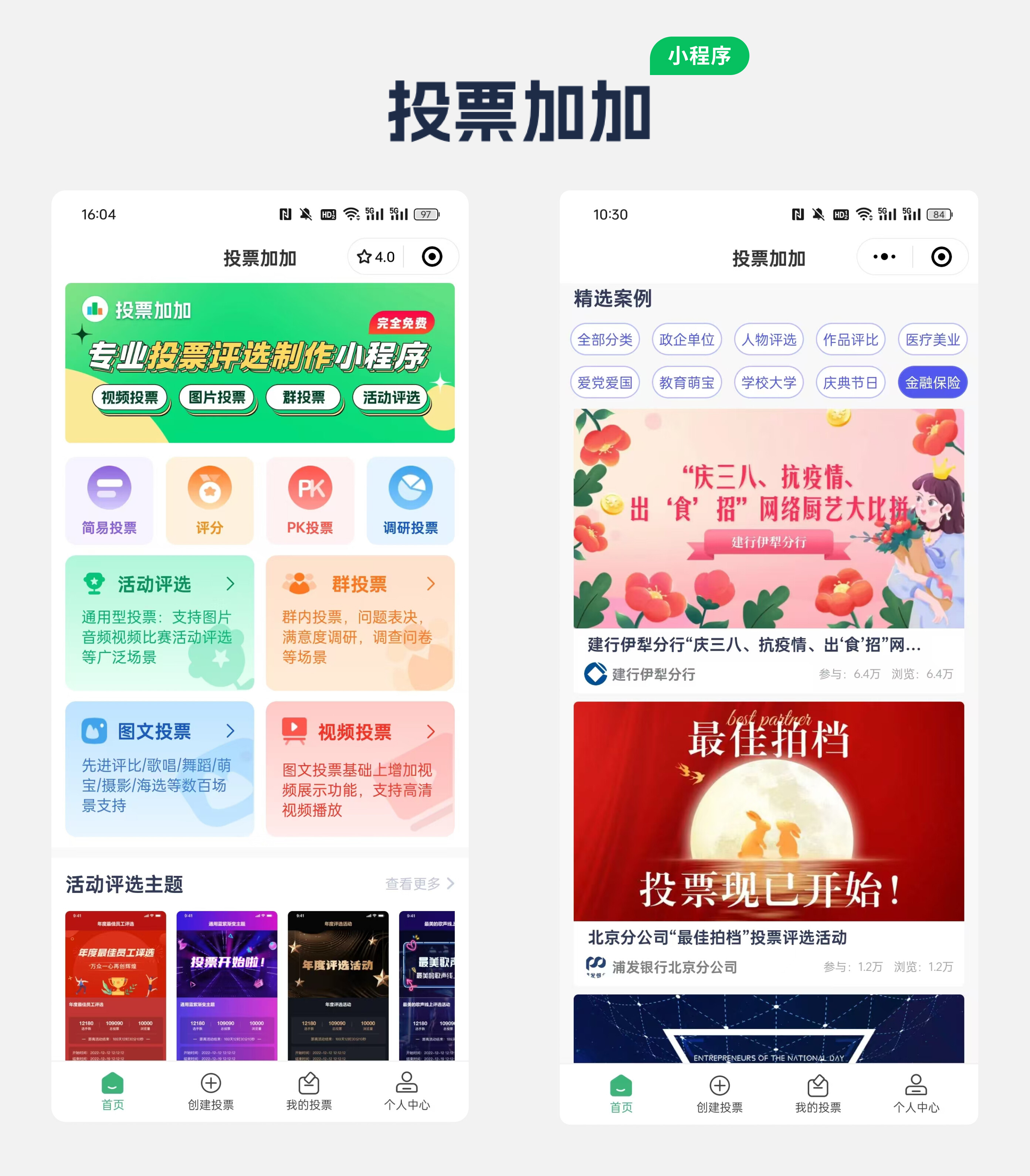 进入投票加加小程序后,根据个人或团队需求,选择合适的投票类型,如群投票、图文投票、视频投票、调研投票或评分投票等。