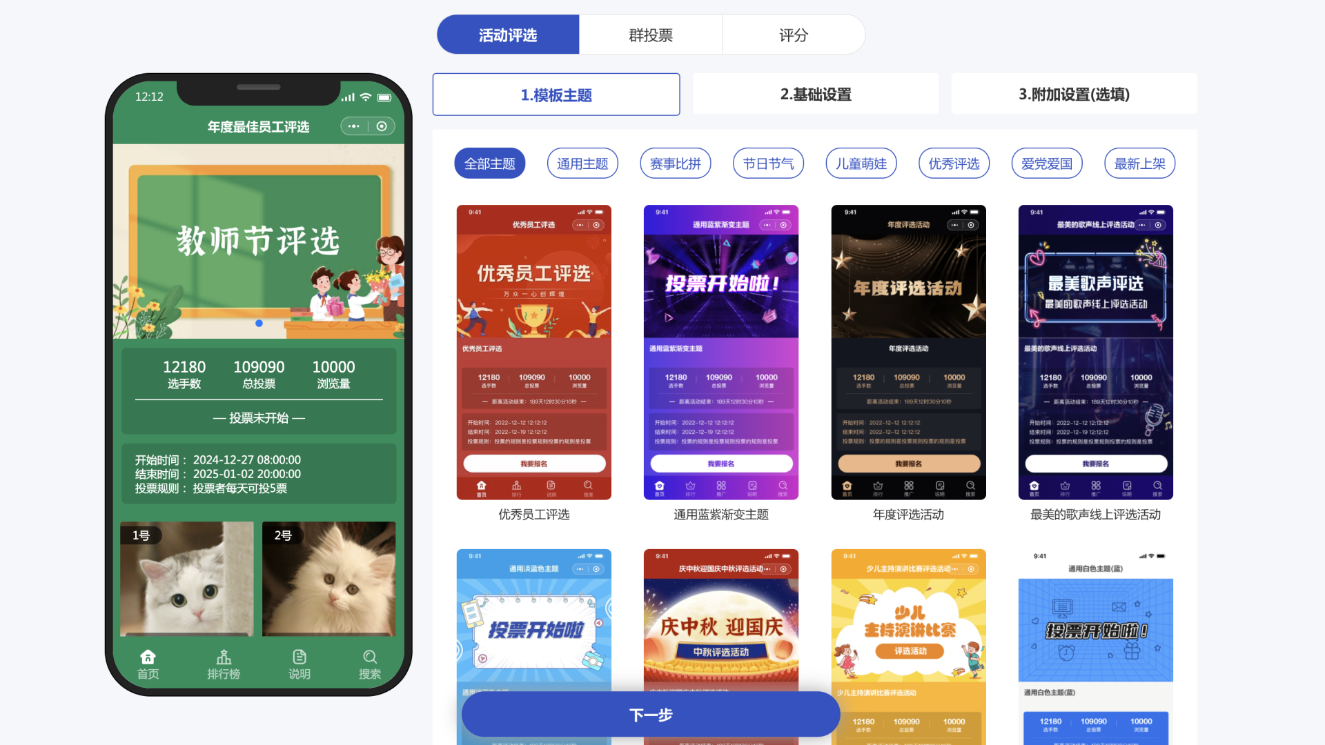 模板选择:投票加加提供海量精美主题模板,供您免费使用。