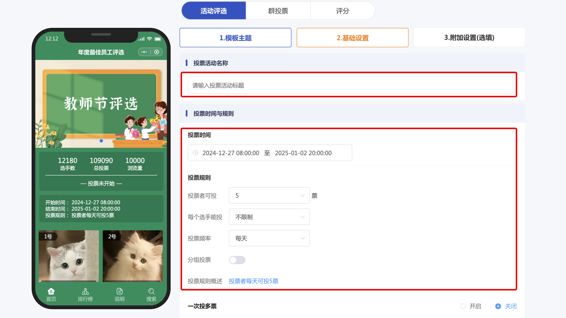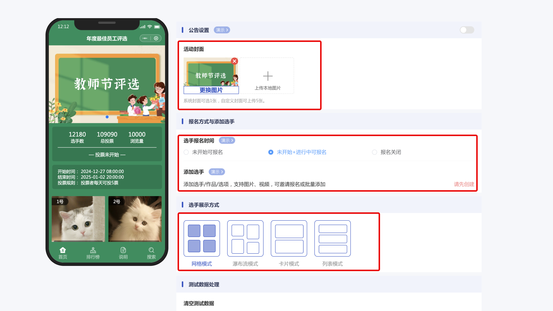 视觉呈现:上传精心挑选的活动封面与背景图,选择契合主题的背景样式,以及选手展示方式,让活动页面更加引人入胜。