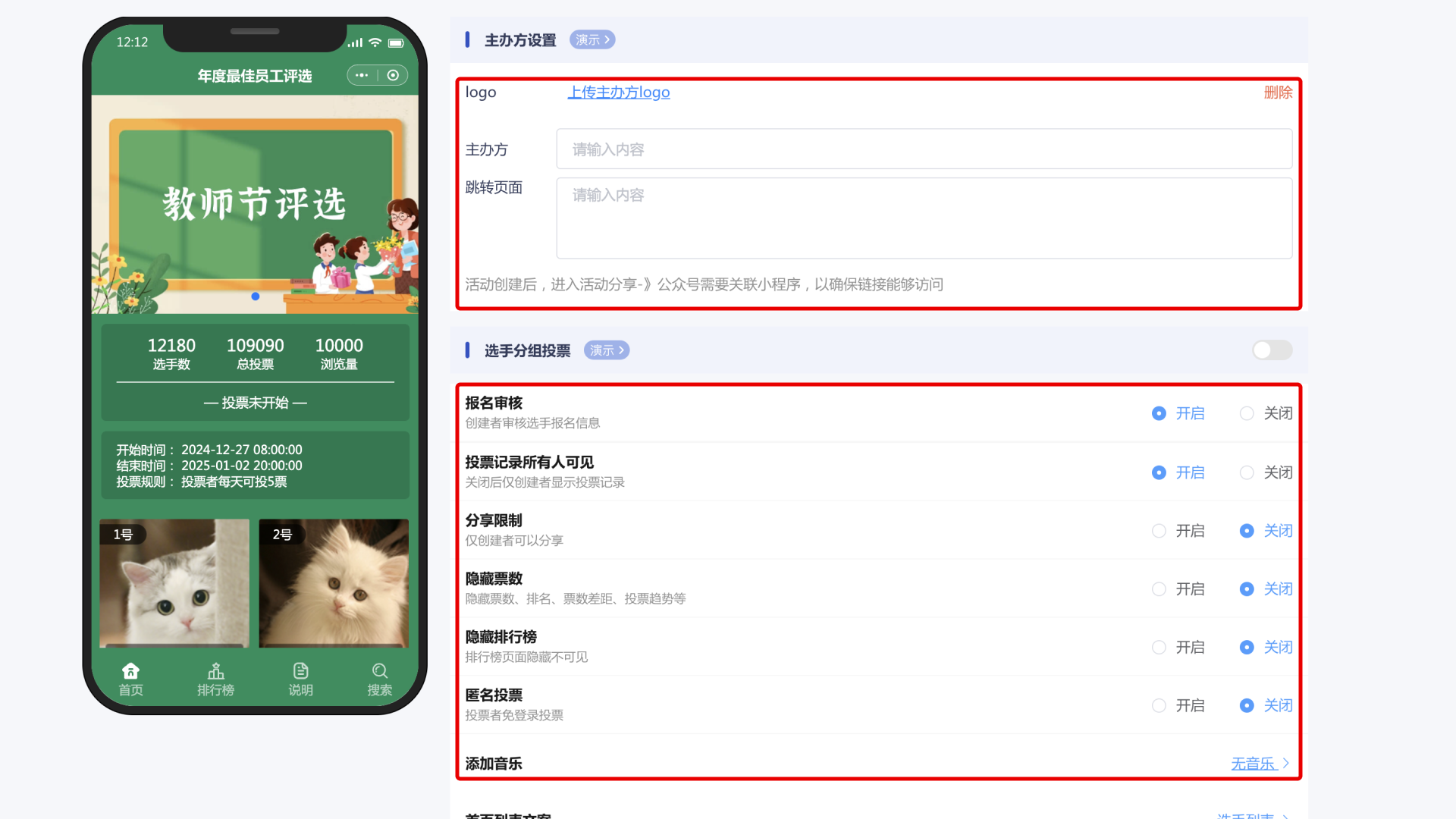 主办方与分组:明确标注主办方信息,上传主办方logo。同时,根据实际需求,将参赛选手进行合理分组,便于投票管理。