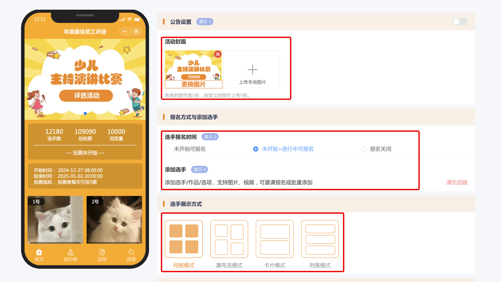 视觉呈现:上传精心挑选的活动封面与背景图,选择契合主题的背景样式,以及选手展示方式,让活动页面更加引人入胜。