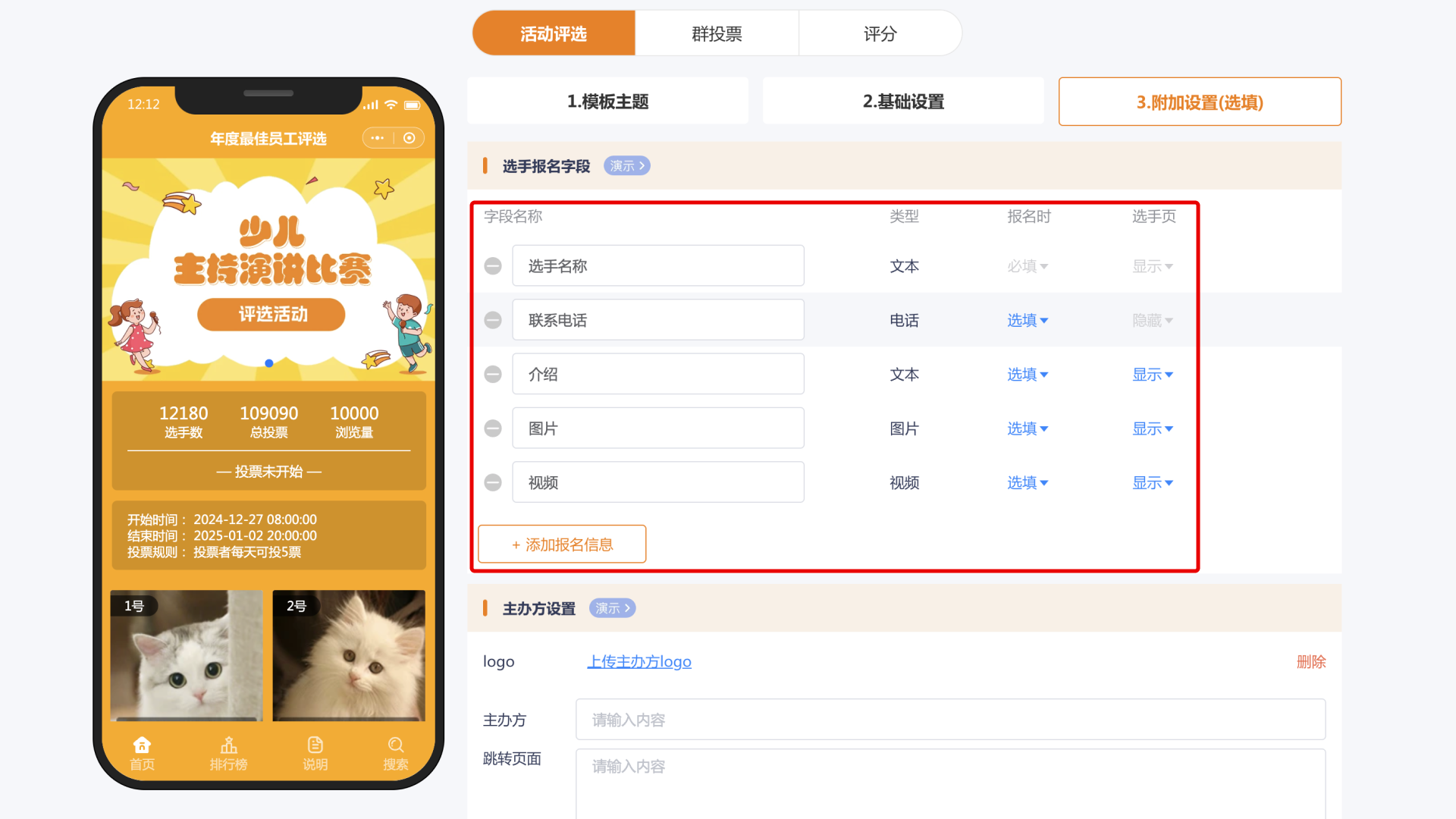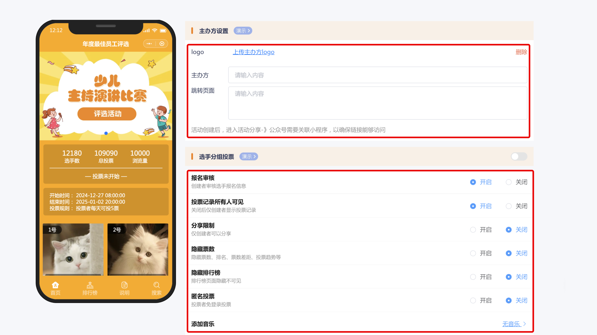 主办方与分组:明确标注主办方信息,上传主办方logo。同时,根据实际需求,将参赛选手进行合理分组,便于投票管理。