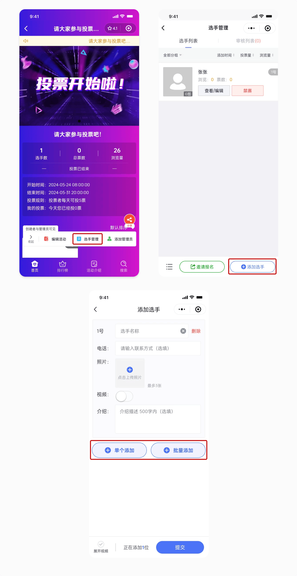 点击进入视频投票创建页面后,会看到“添加选手”并点击,可以从手机相册中选择您想要发起投票的视频,或者也可以直接拍摄新的视频上传。在选择视频时,请确保视频的清晰度和完整性,以提供给投票者最佳的观看体验。上传视频后,还可以为视频添加一段简短的描述,介绍视频的主题、亮点等信息,帮助投票者更好地理解视频内容。