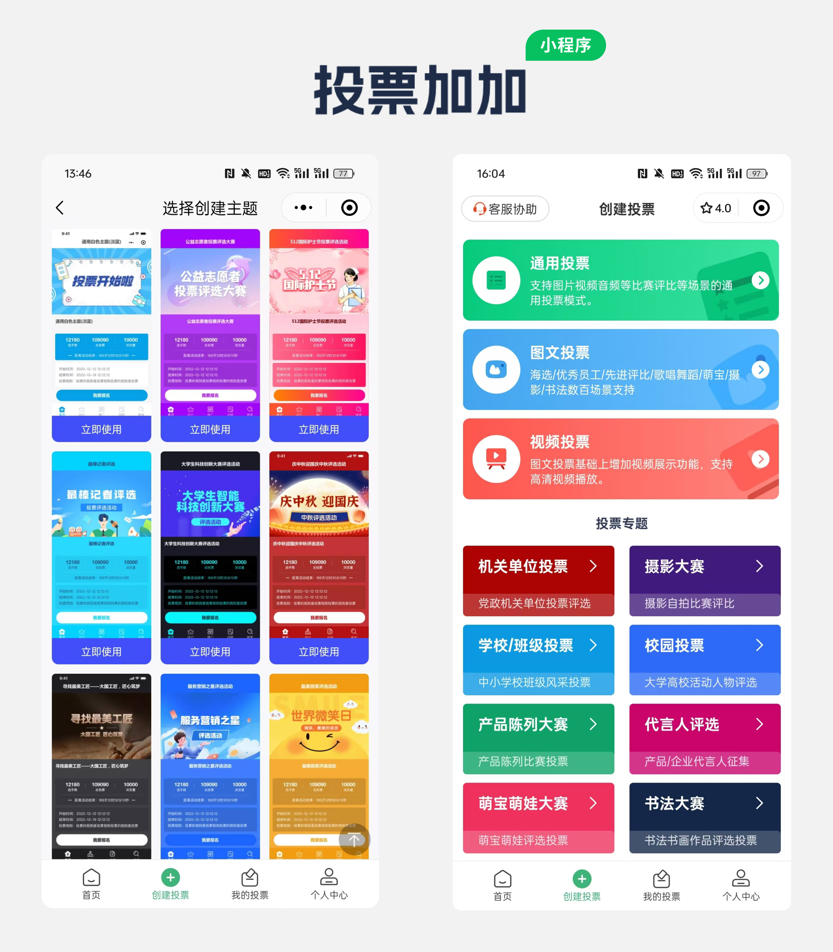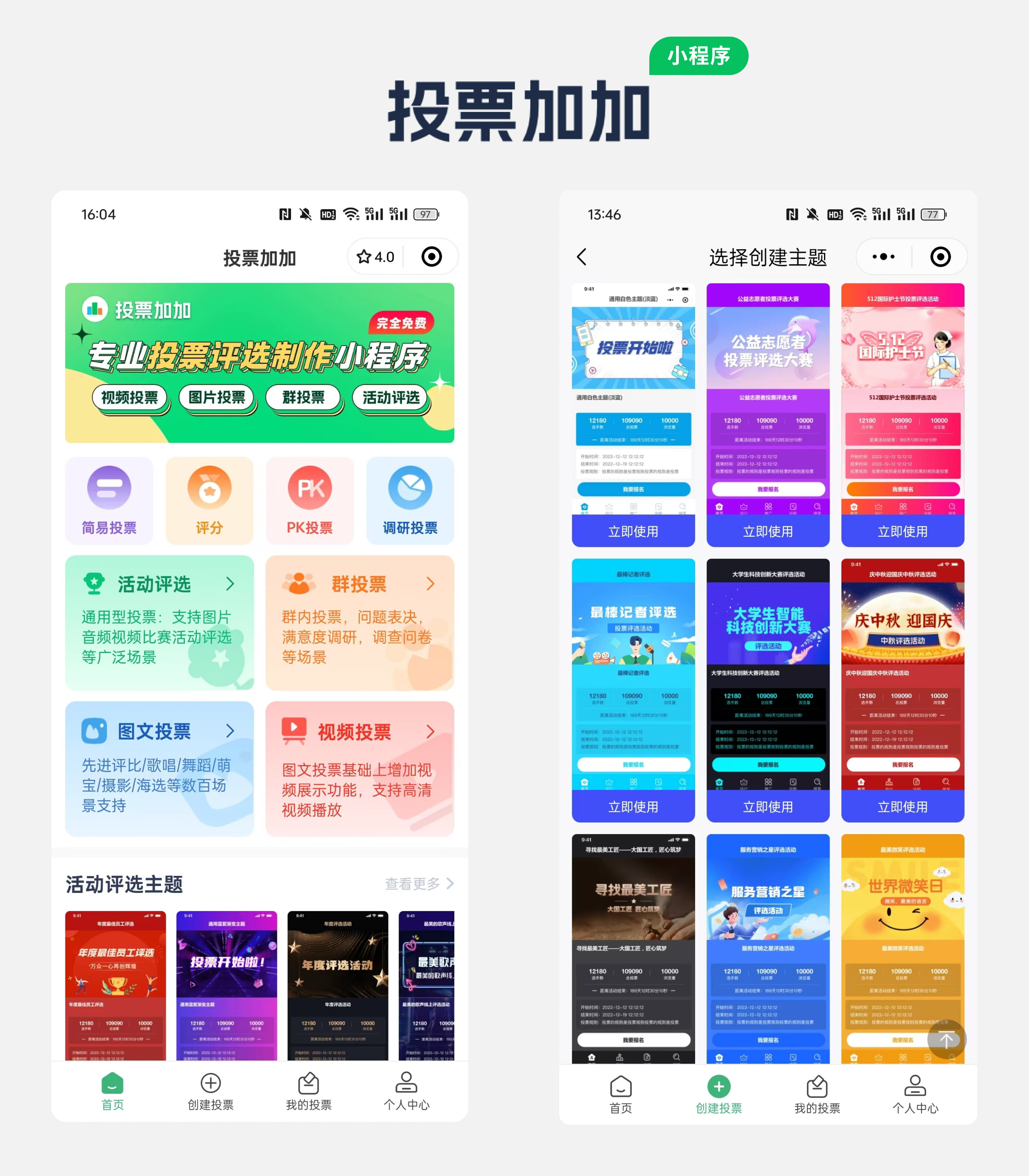 成功进入小程序主界面后,会看到丰富多样的投票类型展示区,直接选择“活动评选”,或者“图文投票”。