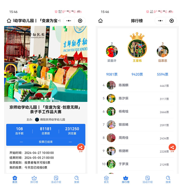 案例二:绵阳京师幼学幼儿园举办了「变废为宝·创意无限」亲子手工作品大赛,该活动举办期间,浏览量和参与者都达到了23.1万。