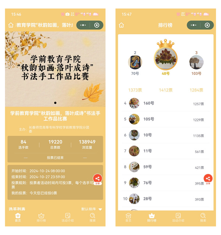 案例三:长春师范高等专科学校学前教育学院分团委举办了“秋韵如画,落叶成诗”书法手工作品比赛,该活动举办期间,浏览量和参与者都达到了13.8万。