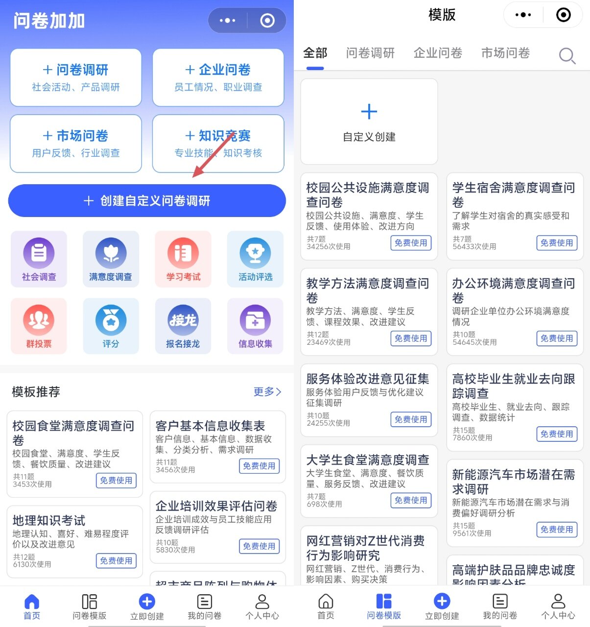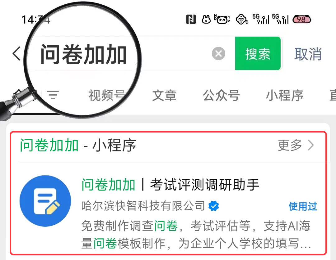 搜索问卷加加小程序。首次使用按提示完成注册或授权登录。