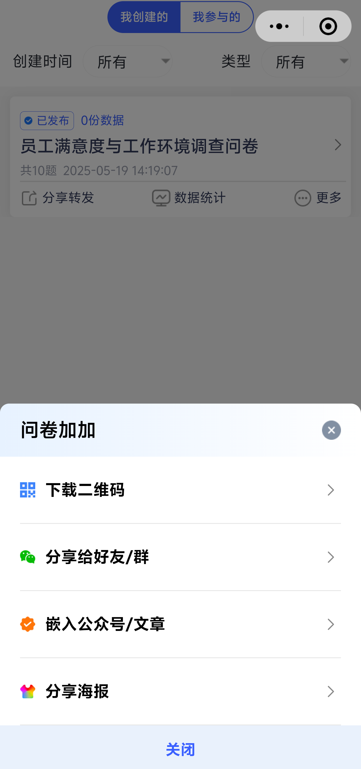 检查无误后点击 "发布",获取链接或二维码,分享至社交平台。小程序实时统计数据,支持随时查看填写进度与分析图表。