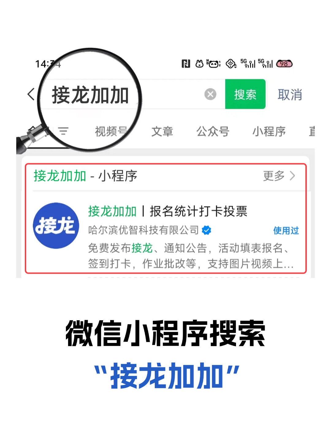 在微信搜索界面,输入接龙加加,点击搜索结果中的小程序标识即可快速进入。