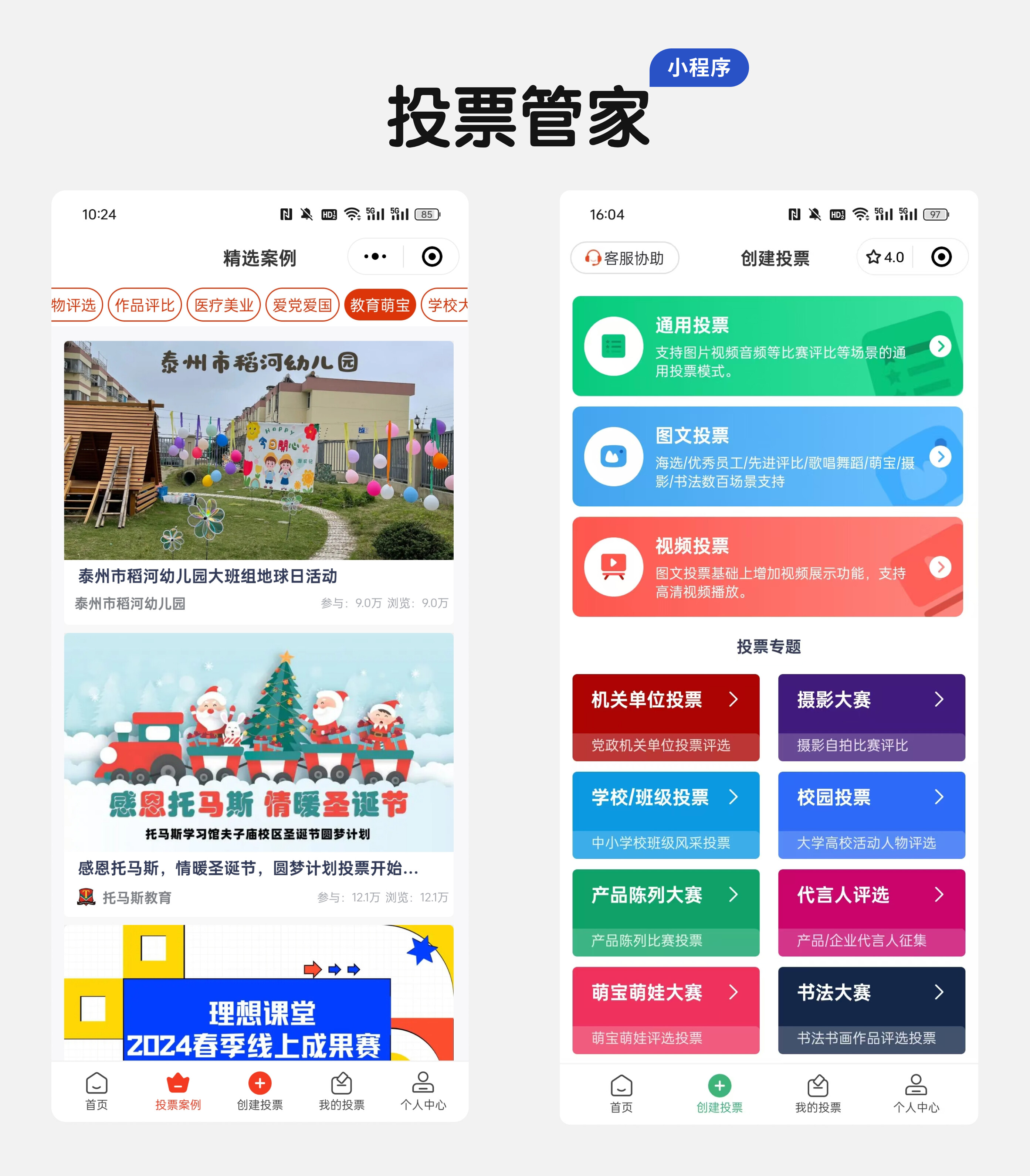 打开微信搜索投票管家,进入小程序首页后,点击“活动评选”“图文投票”或“视频投票”。
