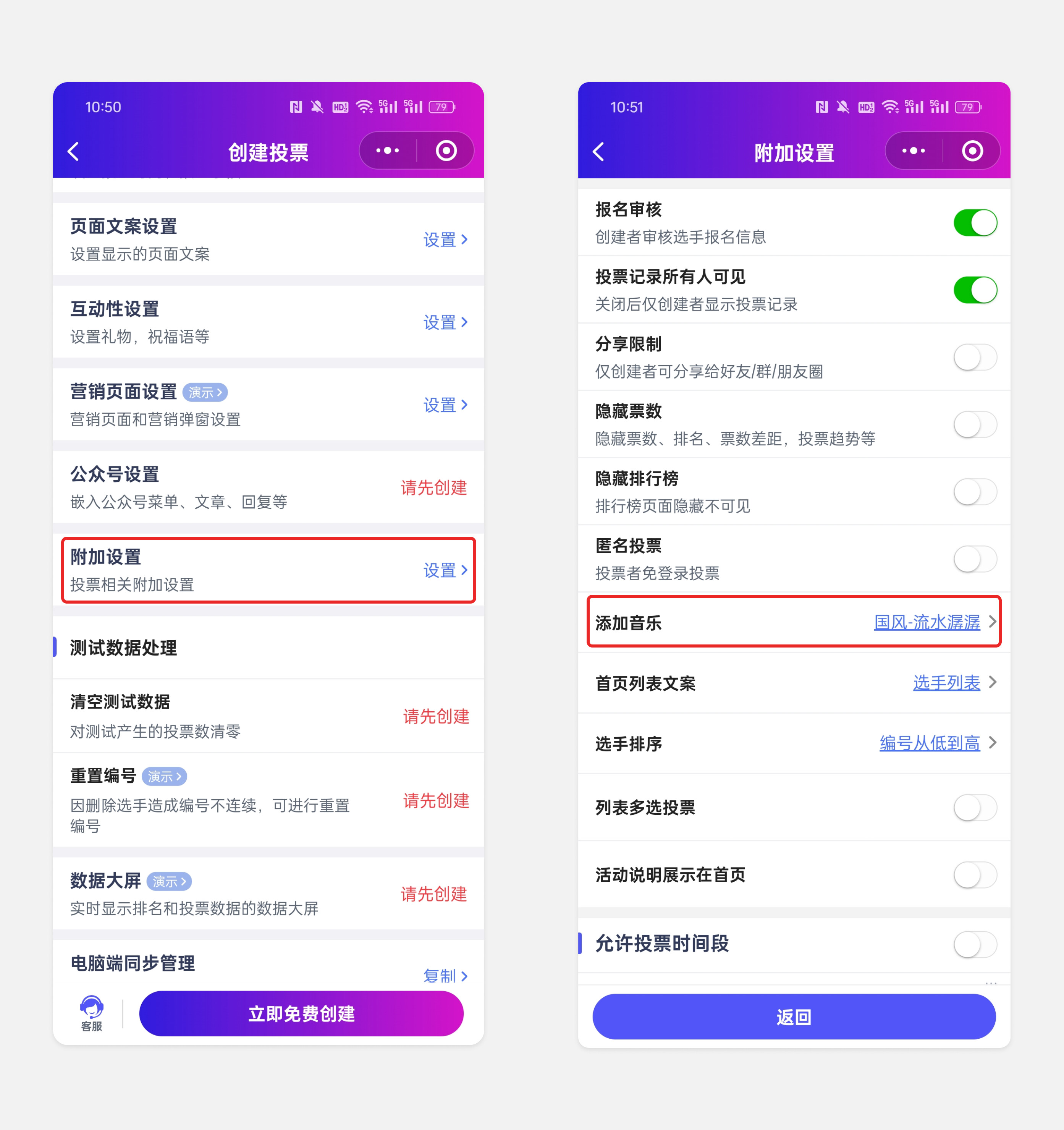 第二步,选择适合你要创建活动的投票模板,详细的填写投票信息,找到附加设置,点击添加音乐,火投票小程序支持免费添加音乐,给你的投票活动添加适合的音乐,最后点击创建,就可以啦!