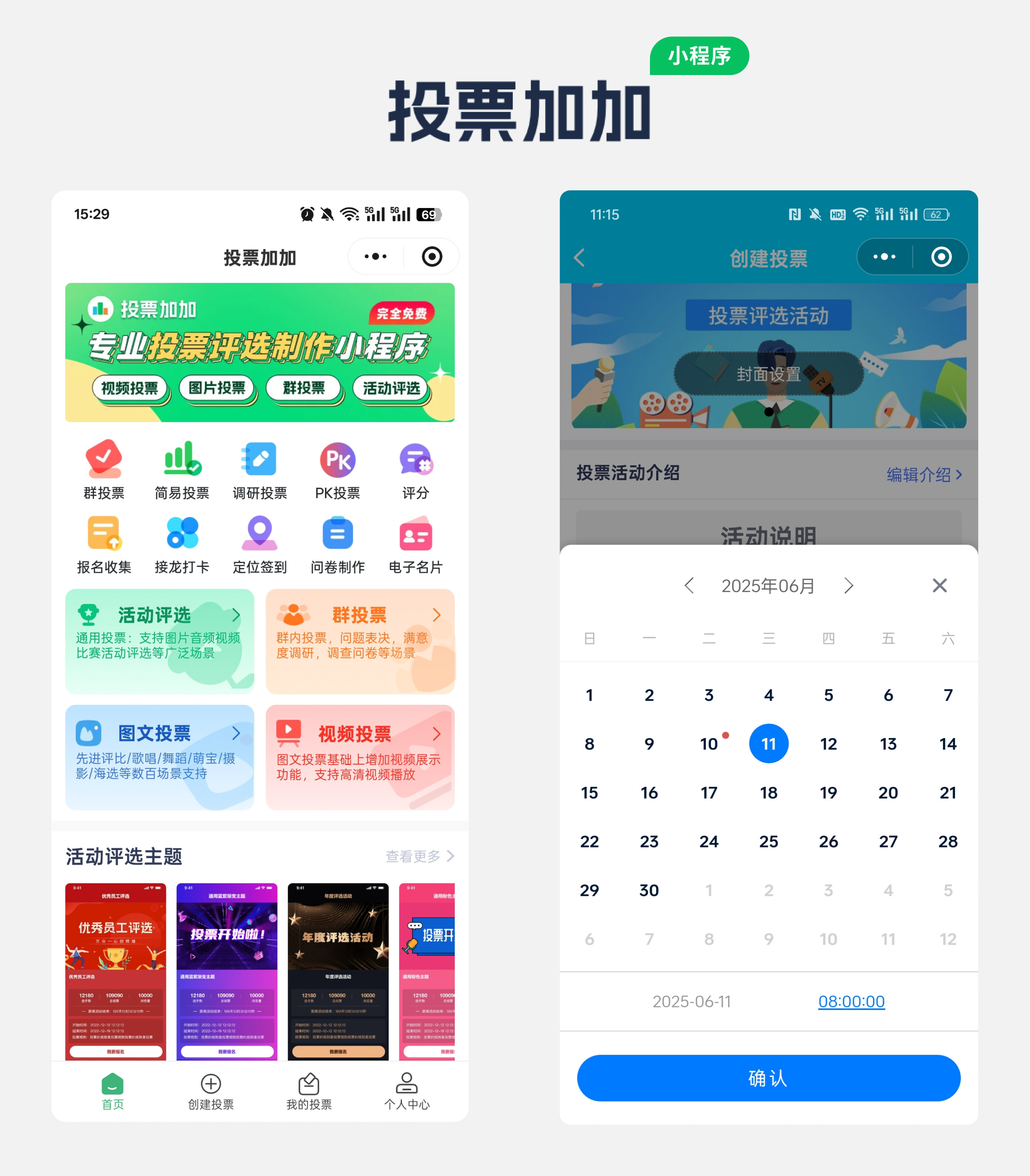 进入投票加加小程序后,新手不会被繁杂的设置项劝退 —— 创建流程被压缩为 “选模板 - 填内容 - 发链接” 三步,全程操作不超过 3 分钟,即使是第一次使用,也能在短时间内生成完整的投票页面。