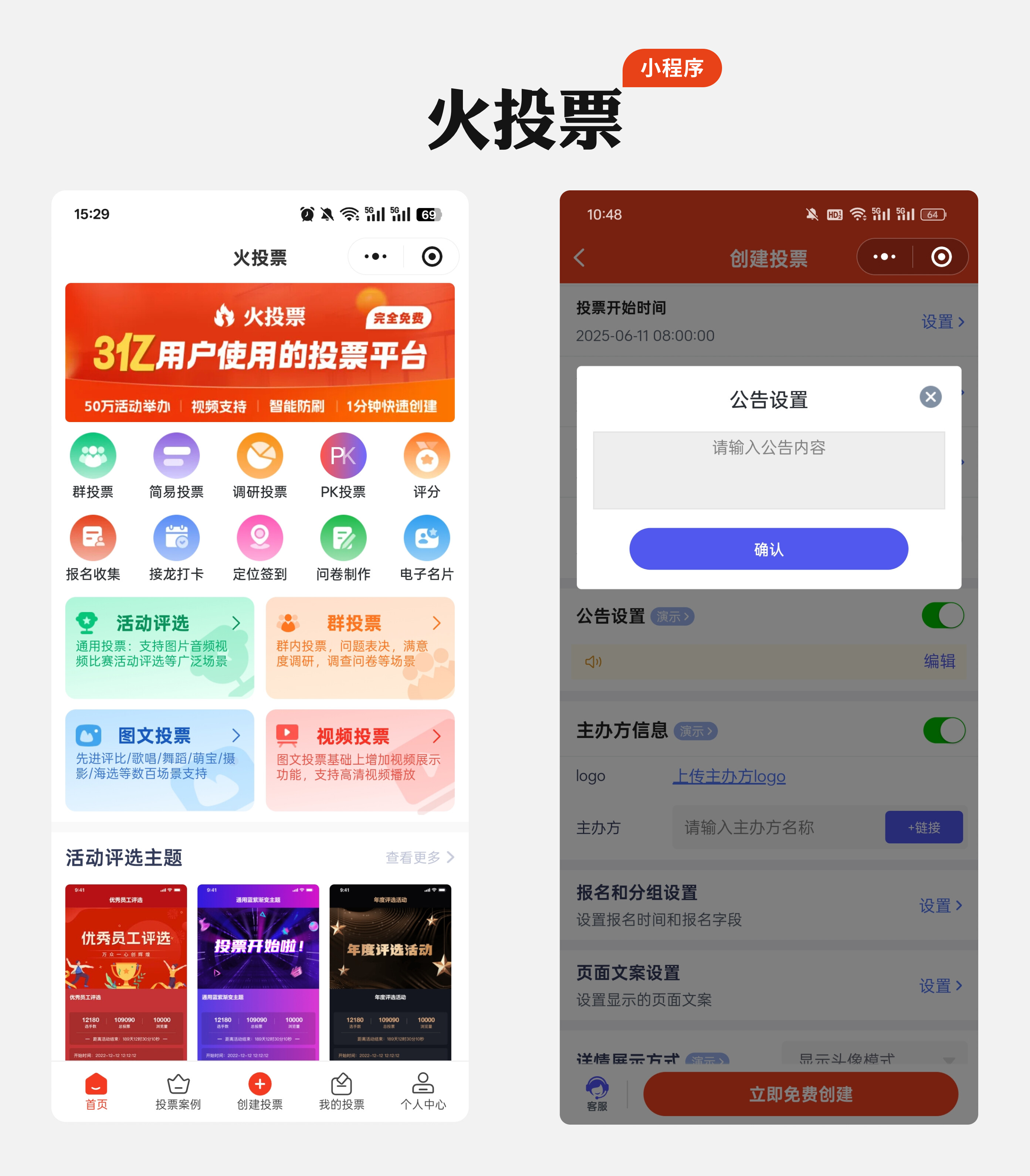 新手打开火投票小程序,首先会被它的模板库惊艳 —— 上百种专业模板涵盖萌娃评选、节日活动、产品比拼等多个场景,温馨可爱、简约大气、炫酷个性等风格应有尽有,无需设计功底,一键套用就能生成高颜值投票页面,整个过程不超过 5 分钟。