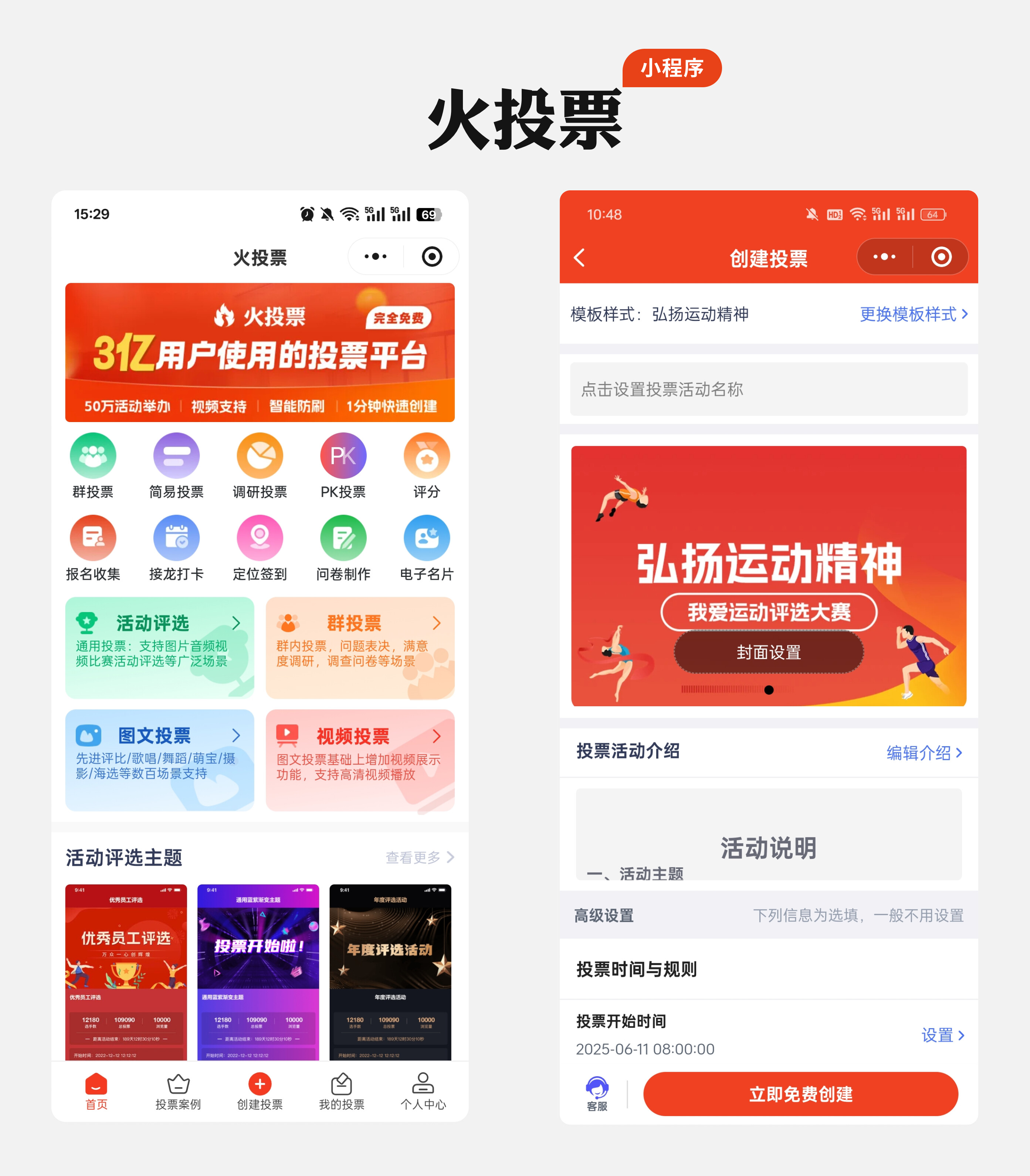 进入首页后,点击底部“创建活动”,在模板库中选择“活动评选”→“礼物/好物评选”模板(已预设图片展示位、礼物简介栏和投票按钮)。如果想自定义设计,点击“自定义创建”即可调整页面风格。