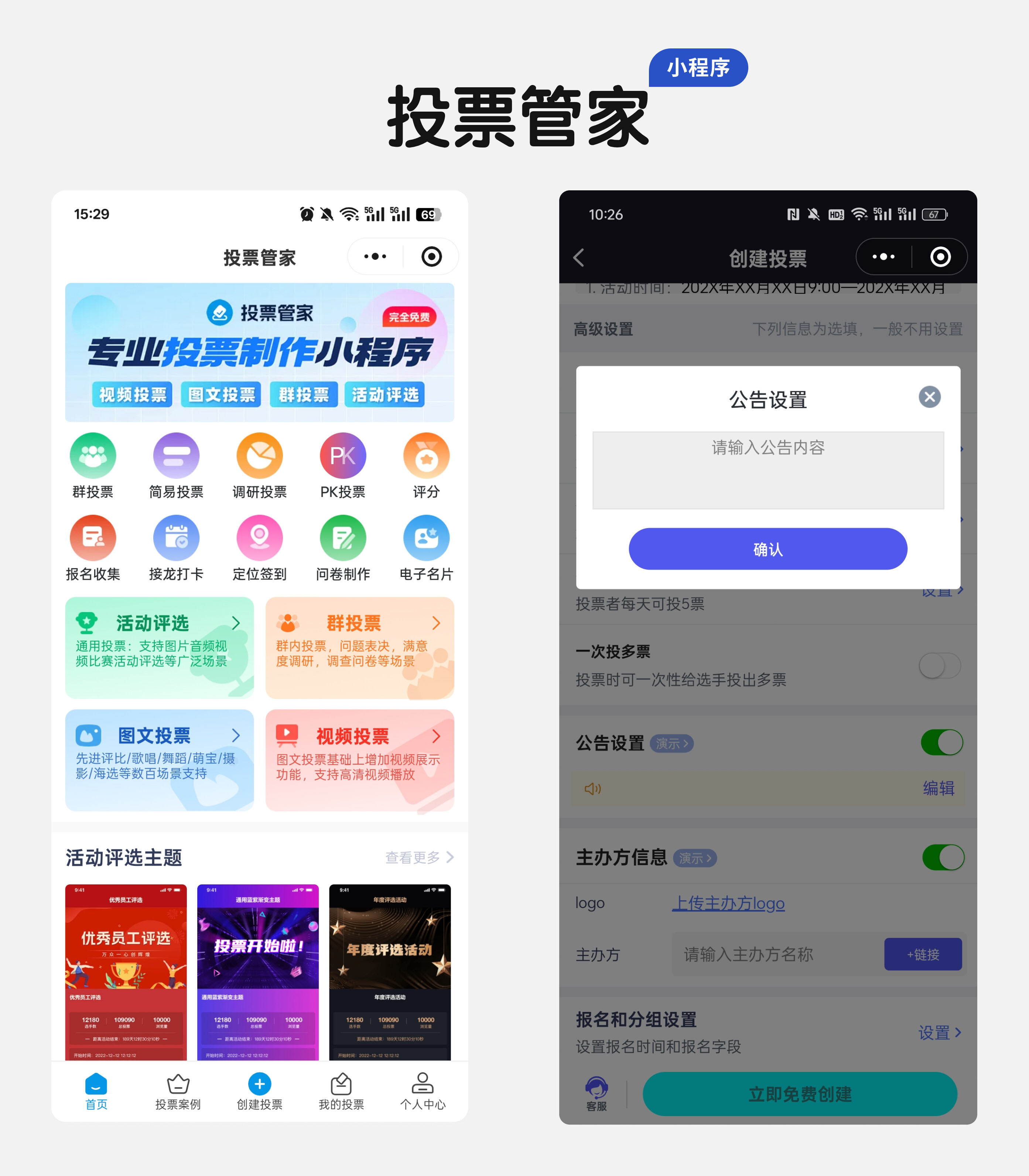 搜索直达:在顶部搜索栏输入 “投票管家”,认准带有官方标识的小程序点击进入;