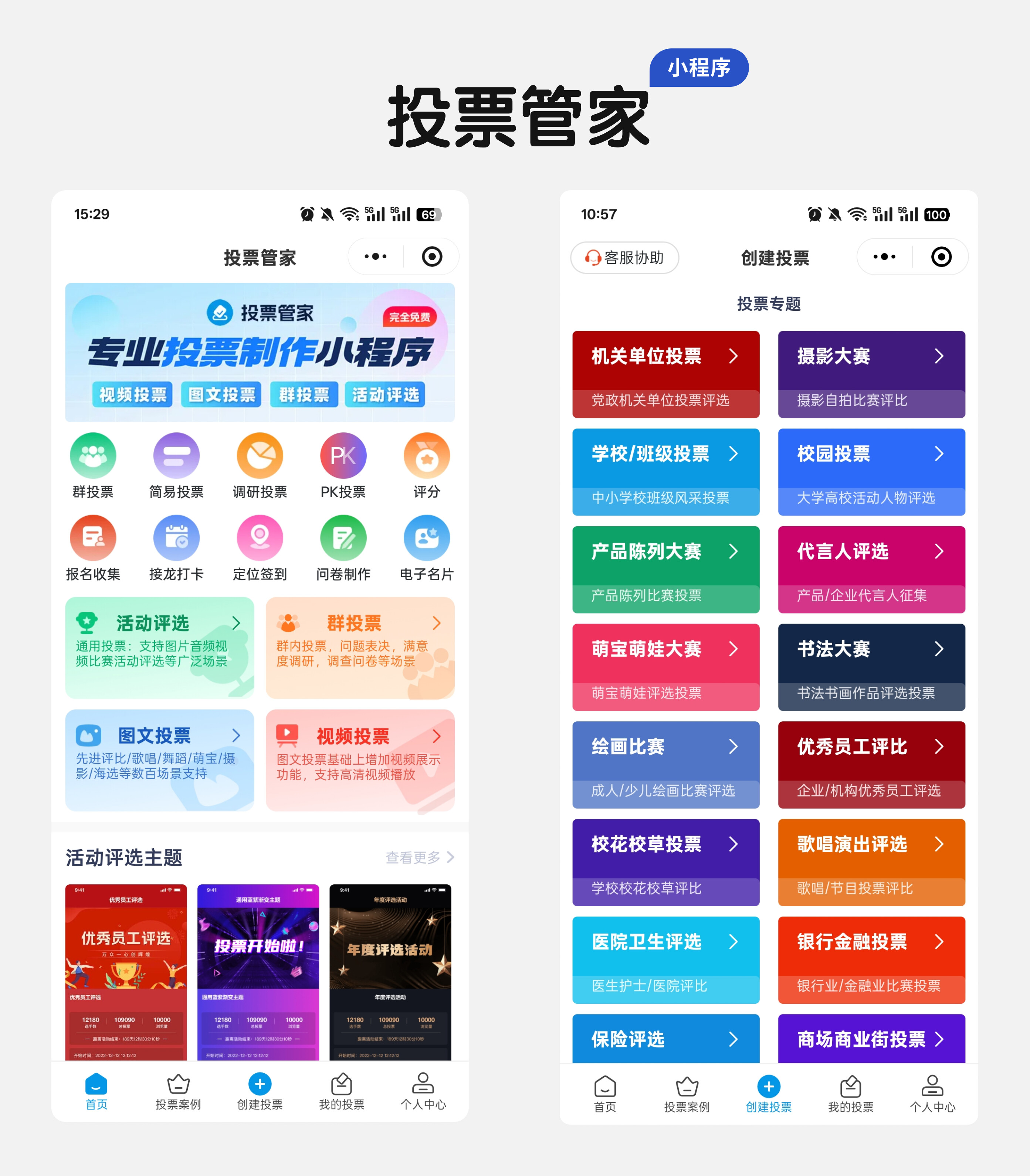 首页直接点创建投票,海量模板任你选:优秀员工、校园评选、摄影大赛、才艺比拼、萌宝投票…… 直接套用,不用从零开始。