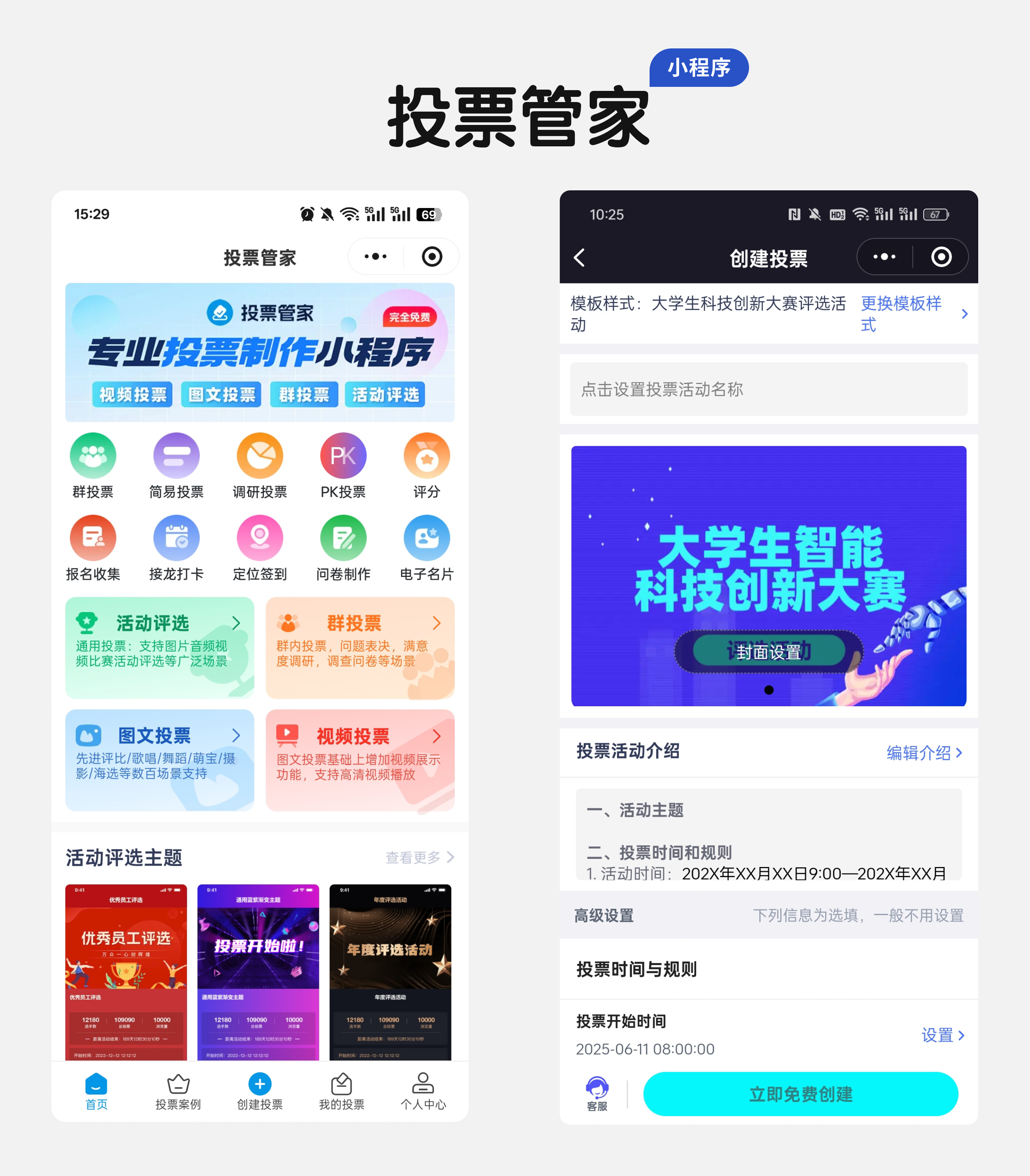 第一步:打开微信,搜索投票管家小程序,授权登录后点击创建活动,选择作品评选模板。