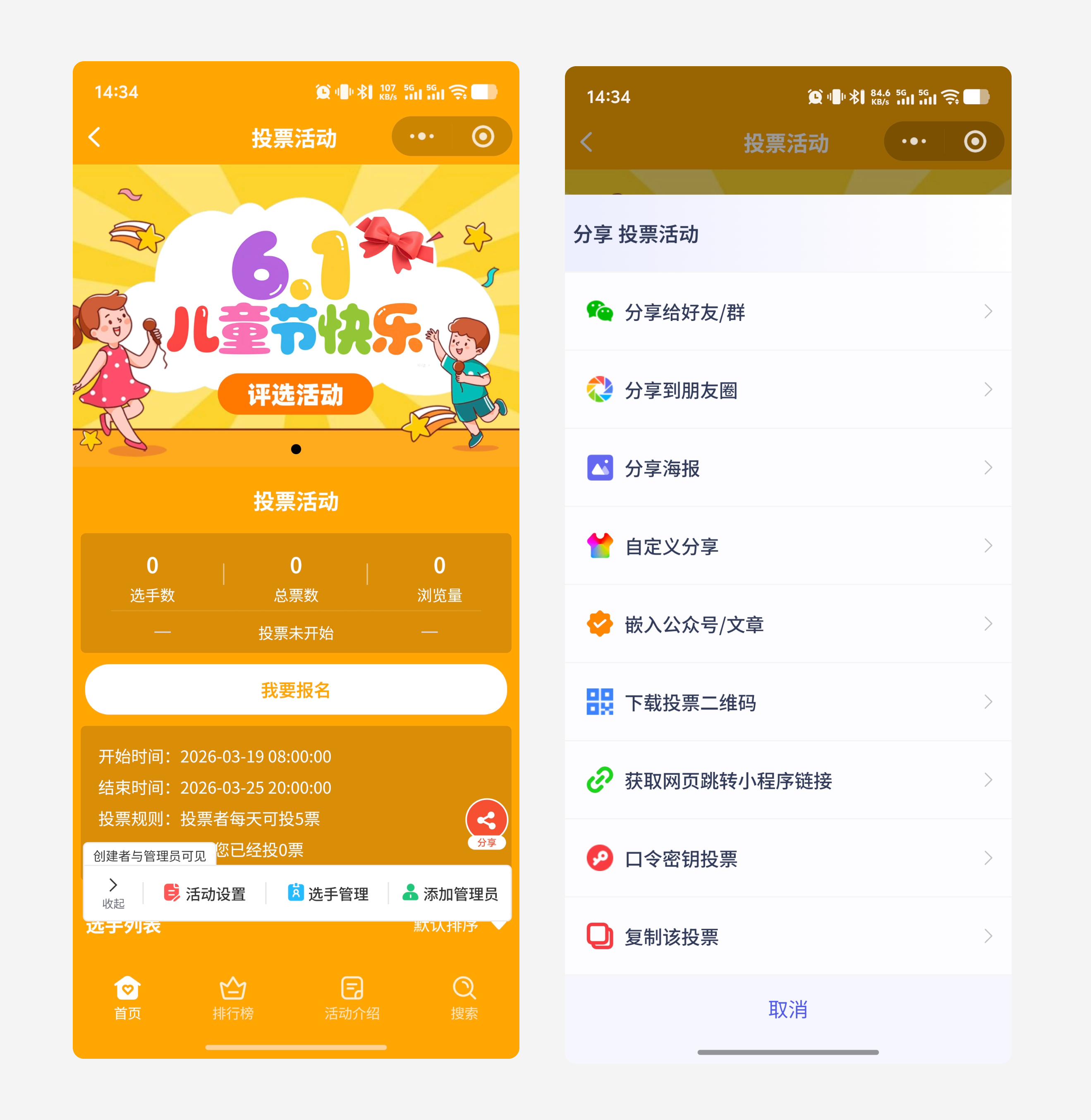 3. 宣传海报:自带活动主题、二维码和投票链接,不用自己设计,直接分享就能提升活动颜值和吸引力,小程序还会自动生成分享文案,省去你编辑文案的时间。